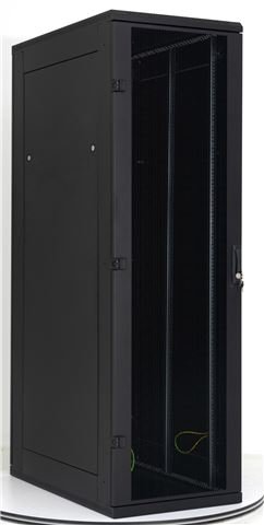 RMA-37-L61-BAX-N1, Tip samostojeći, Visina 37U, Širina 600 mm, Dubina1000 mm, Vrata perforirana 80%, Nosivost ormara 800 kg, Bočne stranice da, Vertikalni nosači – 3 para. Zaključavanje vrata, bočnih i zadnje stranice. Crne boje.